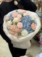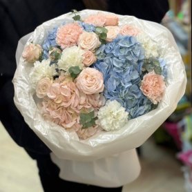 Этот букет - нежное сочетание розовых роз, голубых гортензий и белых гвоздик, создающее гармоничный образ изящества и свежести. Мягкие оттенки цветов придают композиции воздушность и романтичность, делая её идеальной для любого торжества. Букет станет прекрасным подарком для тех, кто ценит элегантность и природную красоту.