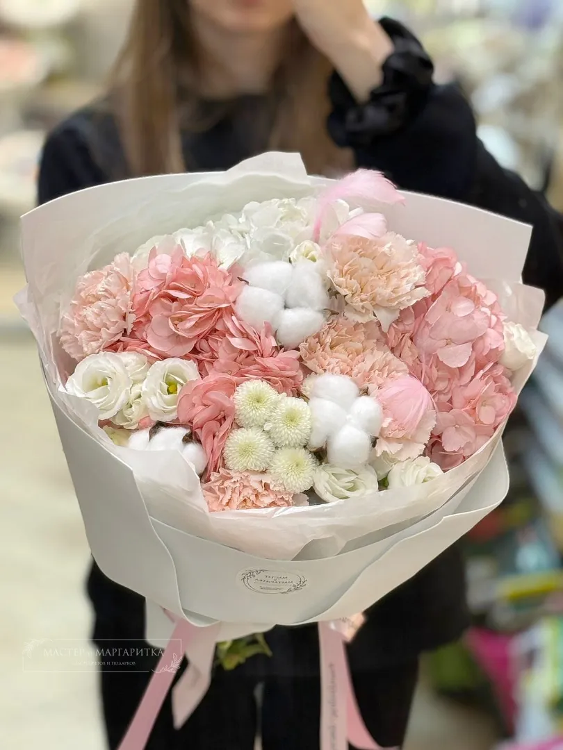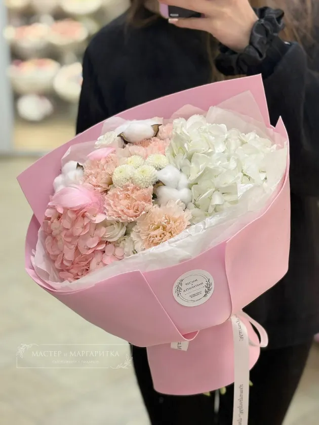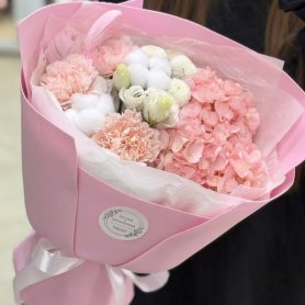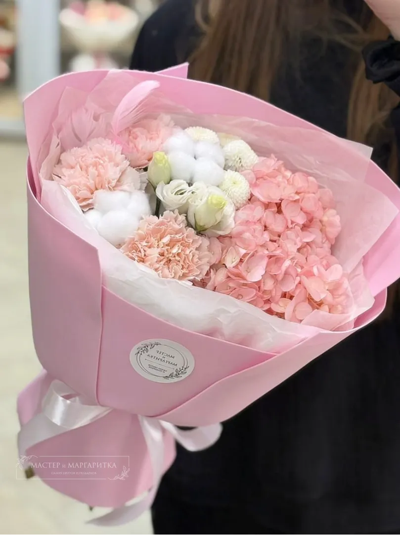 Букет «Нежность» - это изящное сочетание розовых гортензий, нежных диантусов и белого хлопка, создающее атмосферу легкости и воздушности.