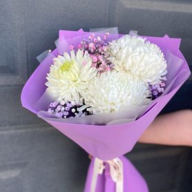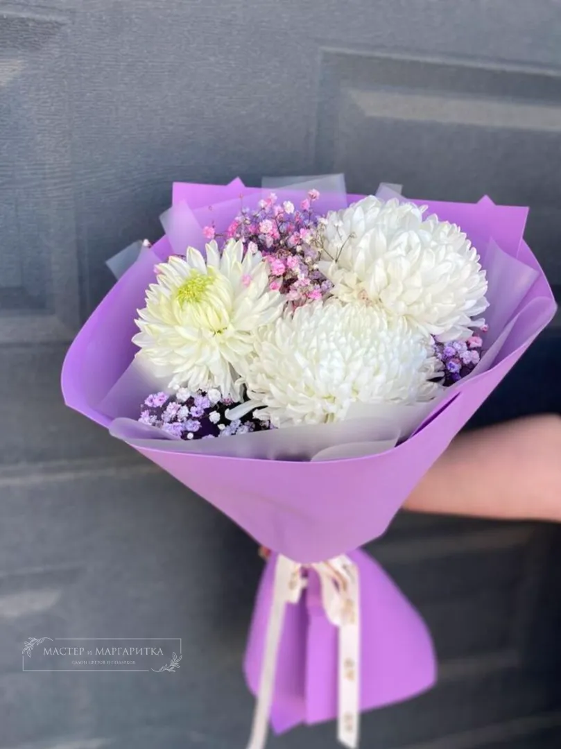 Букет из пышных хризантем и яркой гипсофилы украсит вашего ребенка на торжественной линейке.