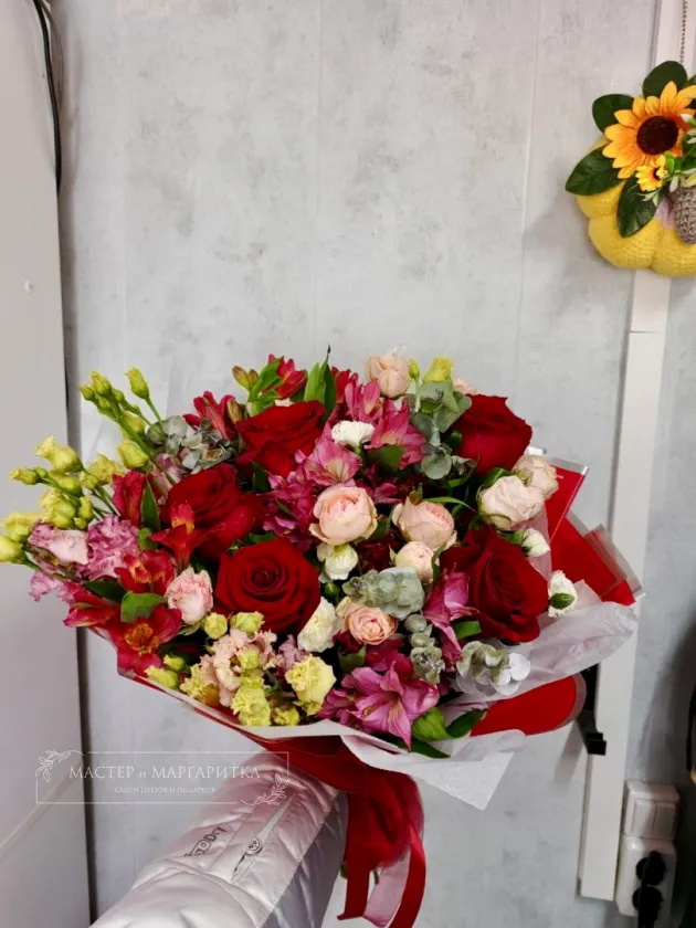 Состав и цветовая гамма на усмотрение флориста. Неизменным остается объем букета.