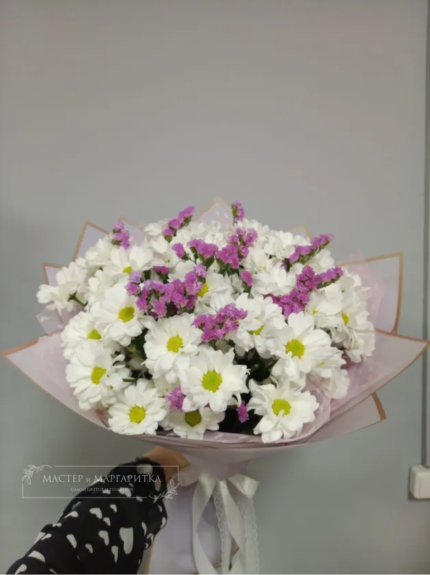 Этот нежный букет с пышной хризантемой и очаровательной статицей, говорит без слов о нежности, любви и заботе! Каждый букет уникален, поэтому возможно отличие по наполнению, цветовой гамме и упаковке от представленного на фото.