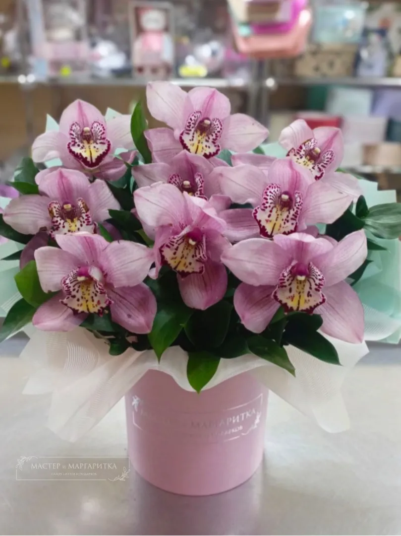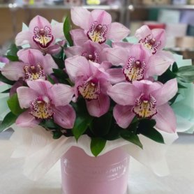 Очаровательная композиция из стойкой орхидеи. Цветовую гамму цветка можно согласовать с флористом при подтверждении заказа.
