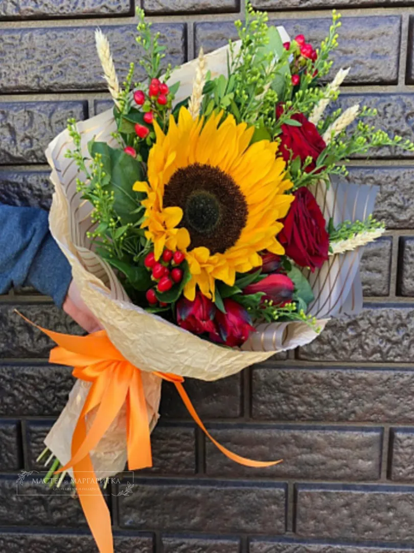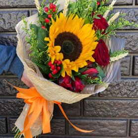 Очаровательный букет для учителя или коллеги с подсолнухом, красные ягодки гиперикума дополняют букет, придавая ему изысканности и игривости.