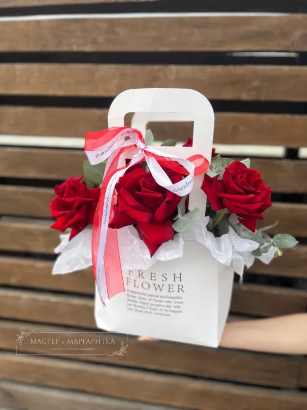 Оригинальная композиция из французской розы в сумочке. Благодаря губке очень долго сохраняется свежесть цветов при правильном уходе.