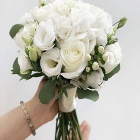 Чудесный букет невесты шаровидной формы. Этот букет - олицетворение самой женственности и преданной любви! Букету невесты уделяется особое внимание, необходимо учитывать тематику мероприятия, стиль свадебного платья и личные цветочные предпочтения, каждый букет невесты уникален, он как произведение искусства, создается в единственном экземпляре, поэтому возможно отличие по наполнению, цветовой гамме и упаковке от представленного на фото. Заказ на изготовление букета минимум за 10 дней. В подарок вы получаете бутоньерку, лепестки роз и 10 % скидку на гостевые букеты.
